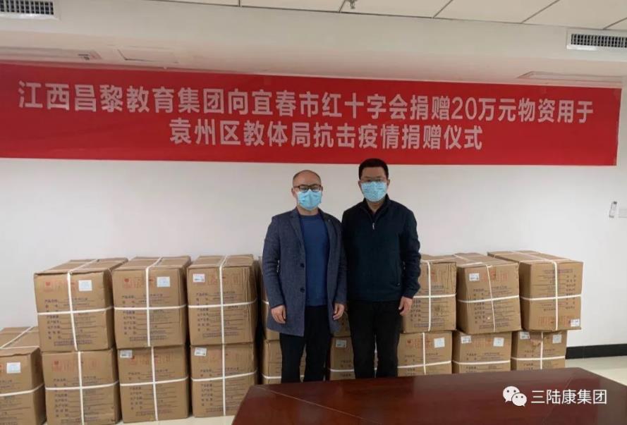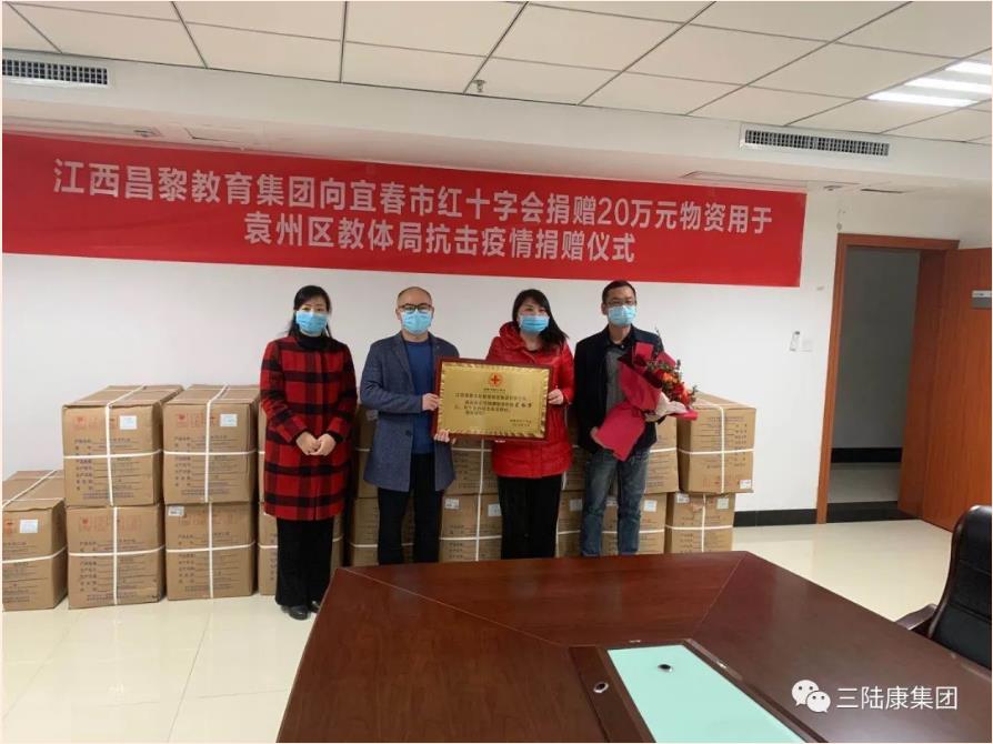 2020年4月2日下午,三陸康集團旗下江西昌黎教育集團有限公司通過宜春市紅十字會定向捐贈宜春市袁州區(qū)教育體育局共計價值20萬元防疫物資,用于防控新冠疫情。